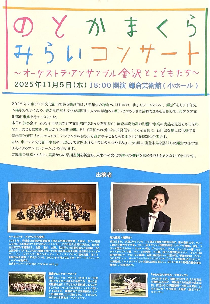 【東アジア文化都市2025鎌倉】 「のと かまくら みらいコンサート」へ。 本年の東アジア文化都市・鎌倉市の「鎌倉ジュニアオーケストラ」と、昨年の東アジア文化都市であった石川県の「オーケストラ・アンサンブル金沢」のコラボレーション企画による、迫力ある素晴らしい演奏に感動しました。 pic.x.com/31hNojOAf1 x.com/oishi_kaori_/s…